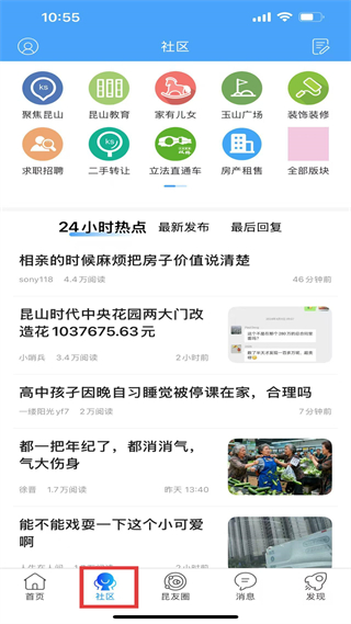 2、社區板塊有聚焦昆山、教育等板塊,展示24小時熱點話題,如相親、小區改造等,用戶可參與討論本地熱點。
