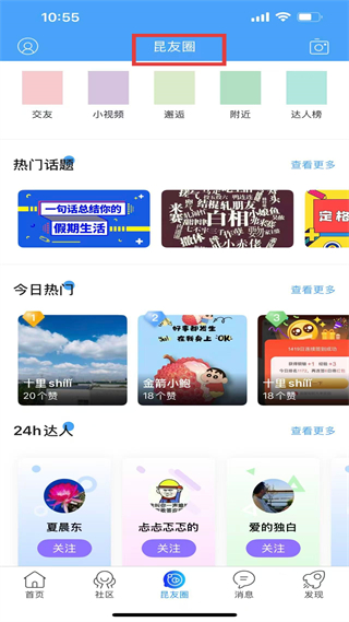 3、昆友圈板塊有交友、小視頻等功能,展示熱門話題、今日熱門內容和24h達人,是用戶社交和分享生活的平臺。
