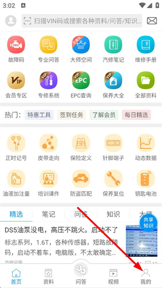 1、進入應用首頁可使用故障碼專業問答等汽修工具,瀏覽精選的汽修問題內容,點擊底部我的選項,進入個人中心界面。