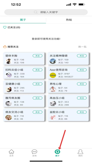 3、圈子頁有推薦關注的醫學興趣小組,涵蓋多類醫學分類,支持熱帖查看,助力用戶開展醫學領域交流。