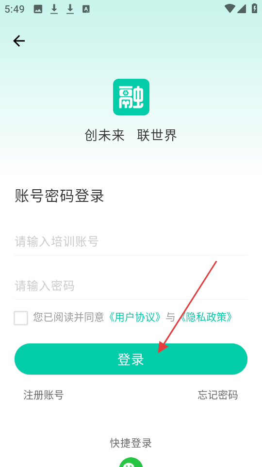 1、登錄界面主打賬號密碼登錄,于對應框填培訓賬號密碼,勾選協議后點登錄另有注冊與快捷登錄途徑。