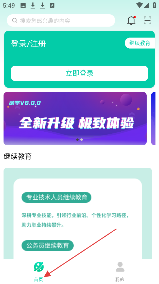 3、點首頁上方是登錄注冊區域及繼續教育快捷入口,下方展示融學新版本升級內容強調帶來極致體驗。