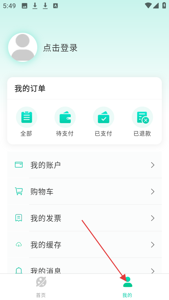 4、我的頁面頂部提示點擊登錄,下方有我的訂單區分待支付等狀態、賬戶購物車等個人管理功能模塊。