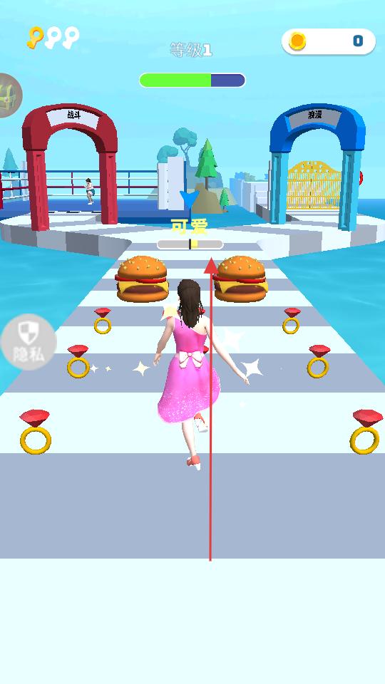 2、繼續操控角色移動收集鉆石戒指等物品,避開漢堡等障礙物,朝著可愛風格的目標前進,改變角色的風格屬性。