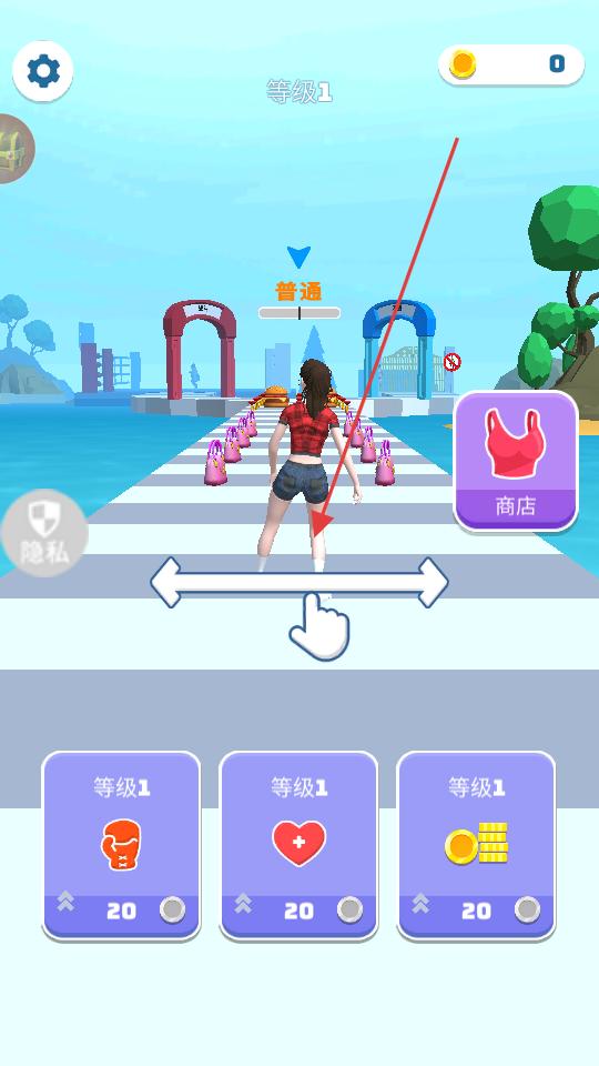 1、進入等級1操控角色在跑道上左右移動,收集粉色包包等物品,同時根據跑道上的標識,選擇普通風格的路徑,開啟跑酷進程。