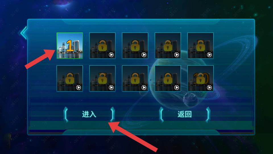 2、進入關卡選擇界面,能看到多個關卡,選擇標有1的關卡,點擊進入,即可開啟該關卡的戰斗。