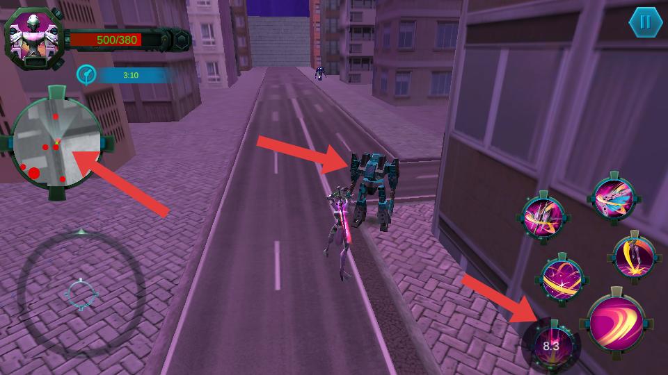 3、戰斗中左側有小地圖可查看敵人位置,操控機甲移動,右側有技能按鈕,點擊釋放技能,與敵人的機甲交戰。