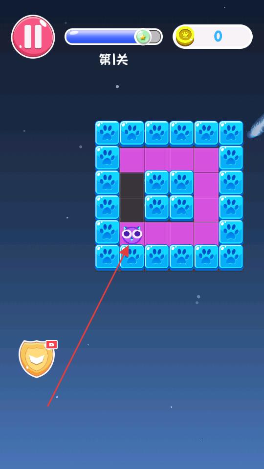 4、進入第1關后操控紫色的小角色,在藍色帶爪印方塊和紫色區域組成的關卡中移動,嘗試通過移動角色,完成關卡要求,推進進程。