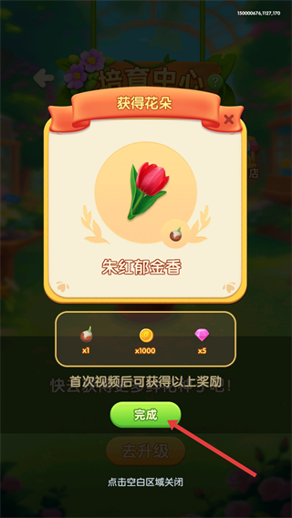 4、完成培育后,可獲得相應的花朵,比如朱紅郁金香,還能得到種子、金幣、鉆石等獎勵,點擊完成,結束本次培育。