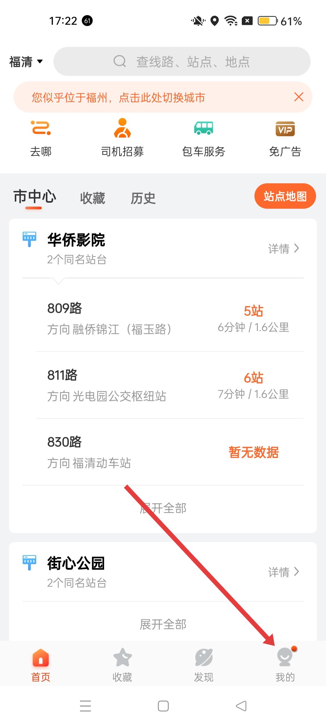1、進入掌上公交首頁,可查看福清地區公交站點信息,如華僑影院的公交路線,點擊底部我的可進入個人界面。
