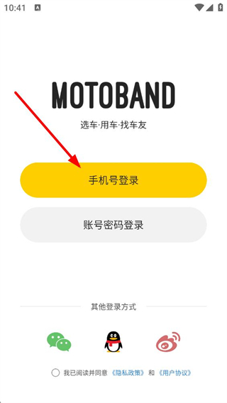 1、進入MOTOBAND登錄界面,可選擇手機號登錄、賬號密碼登錄,也可使用微信、QQ、微博等其他登錄方式,勾選同意隱私政策和用戶協議后進行登錄。