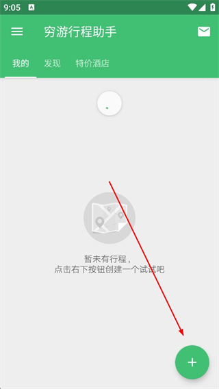 1、打開軟件進入主界面,查看暫無行程的提示,點擊右下角加號按鈕,進入行程創建頁面,開始規劃旅行行程。