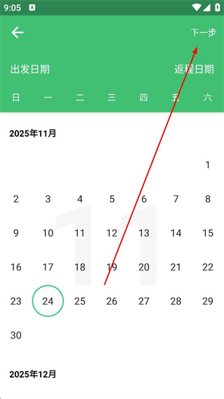 2、進入日期選擇頁面,選定2025年11月24日作為出發日期,確認日期后點擊下一步按鈕,繼續完善行程信息。