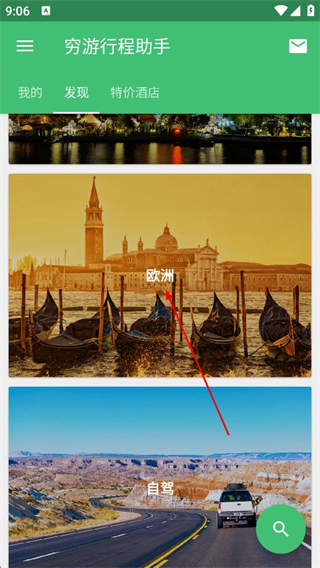 4、進入發現頁面,瀏覽歐洲自駕等旅行主題內容,選擇感興趣的主題板塊,獲取對應的旅行行程參考信息。