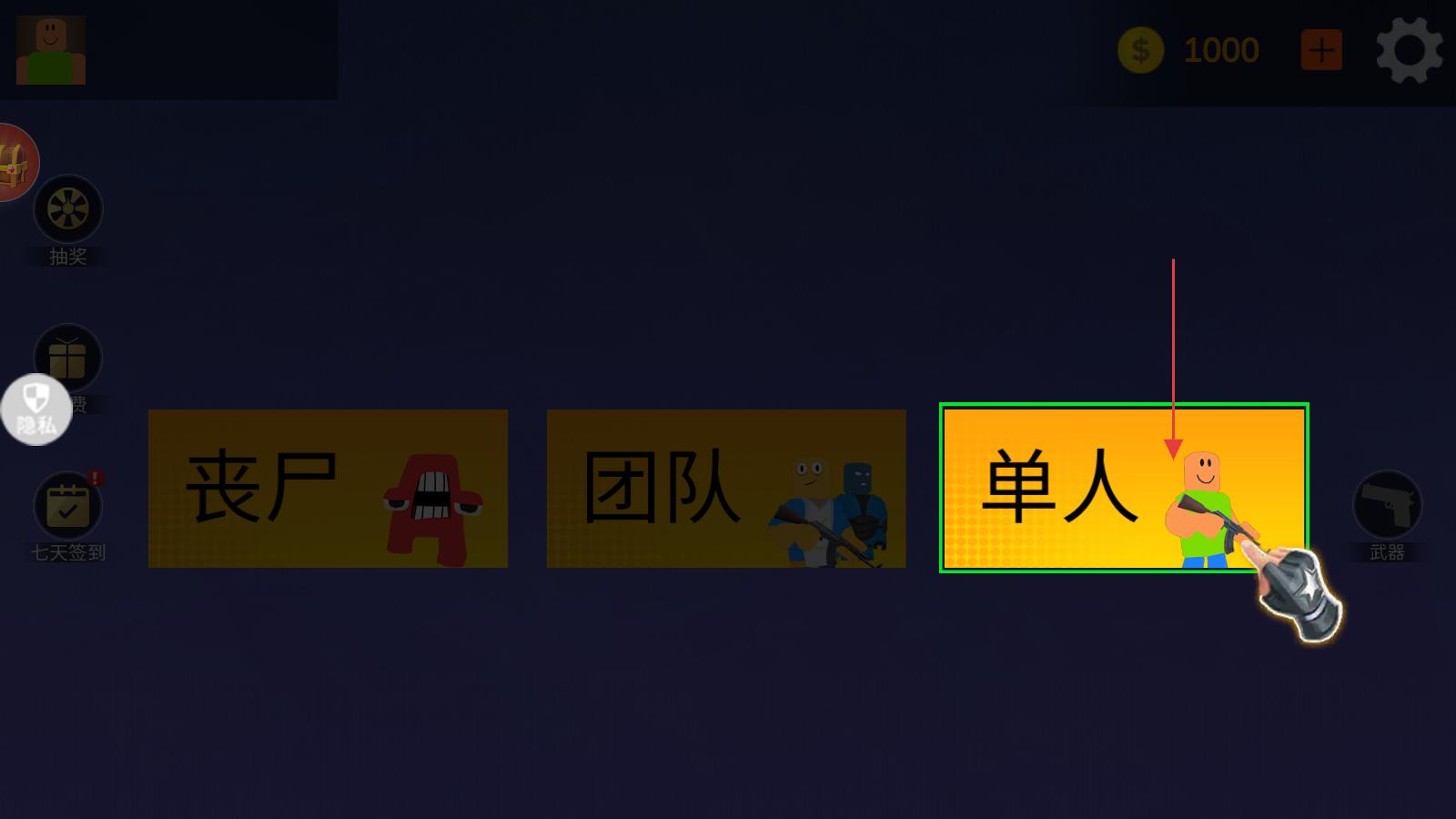 1、進入游戲界面,看到喪尸團隊單人模式選項,點擊單人模式區域,選定單人挑戰,開啟戰斗準備。