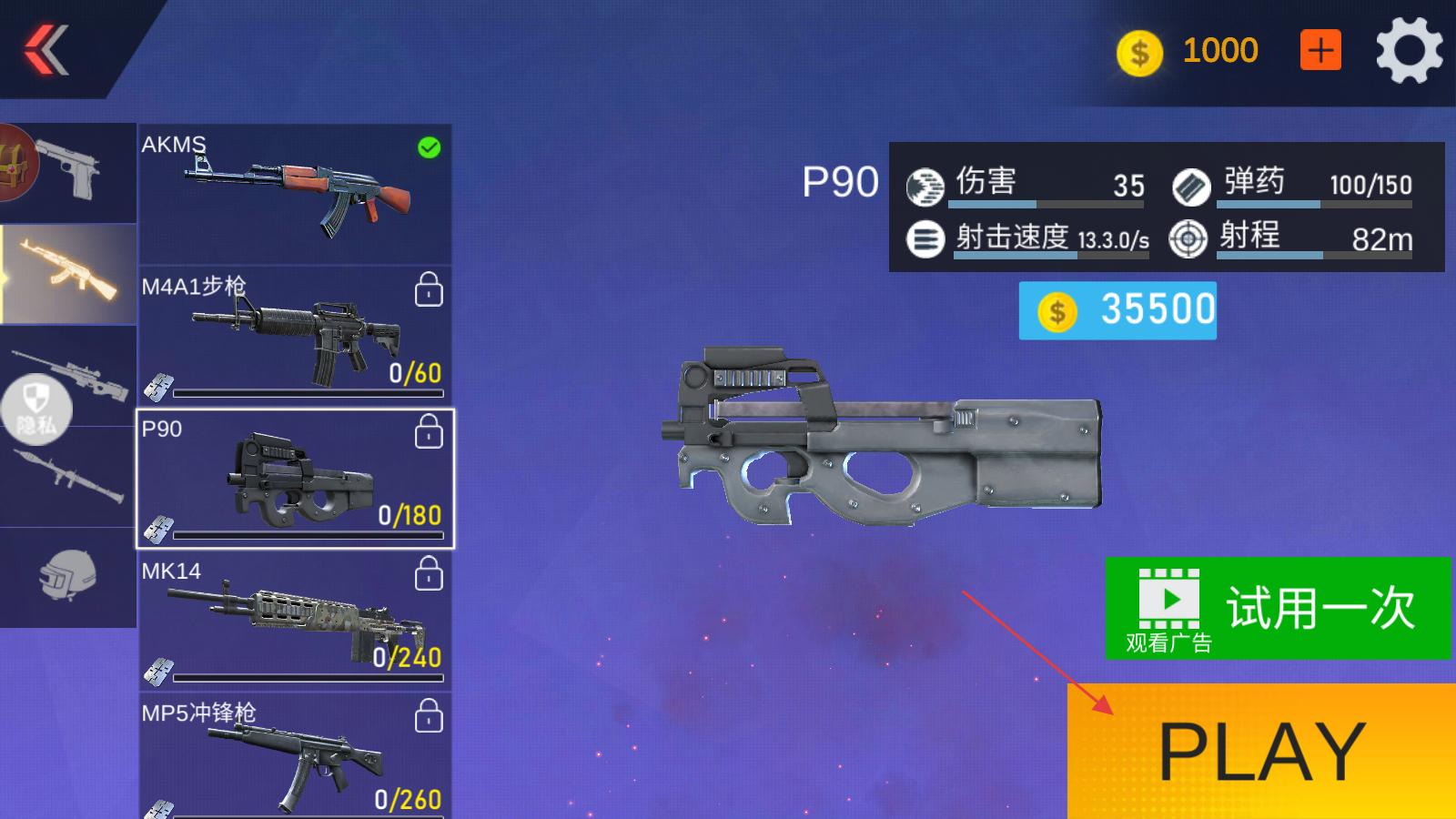 2、進入武器選擇界面,瀏覽各類槍械,確認所選武器后,點擊下方橙色PLAY按鈕,進入戰斗場景,準備對抗敵人。