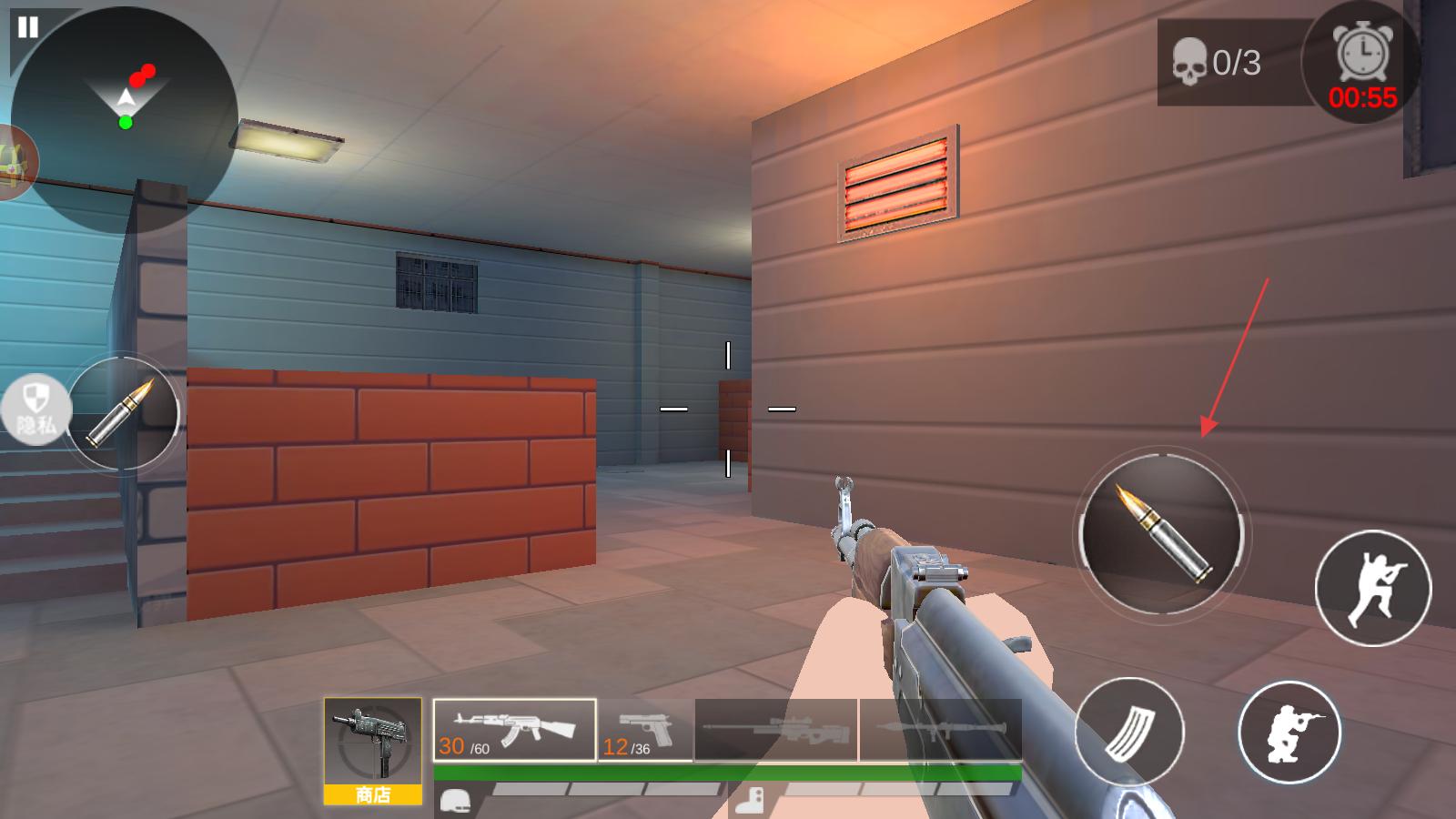 3、進入戰斗場景,操控角色移動,利用屏幕右側子彈按鈕射擊,根據小地圖提示,搜尋并消滅敵人,完成關卡目標。