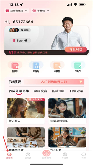 1、進入基礎課頁,可使用翻譯詞典等工具,按學習目標分類課程,獲取適配的入門學習內容,開啟基礎學習。