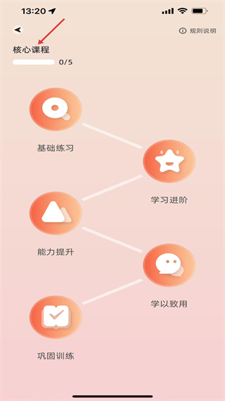 3、進入核心課程流程頁,可查看基礎練習到學以致用的學習路徑,按階段推進,系統完成課程學習。