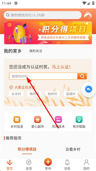 2、進入我們村頁面,可見積分得項目等板塊,設有搜索框可查找對應村莊,還有鄉村信息愛心超市等功能入口。