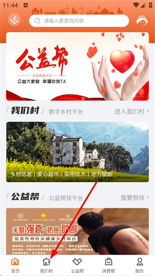 1、進入中國社會幫扶網首頁,能看到公益幫我們村等板塊,底部設有首頁我們村等功能按鈕,點擊我們村進入對應頁面。