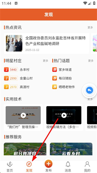 4、點擊底部發現按鈕進入發現頁面,能看到熱點資訊明星村莊等板塊,還有實用技術相關內容可瀏覽。