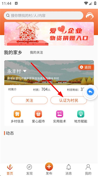 3、我們村頁面選定村莊后,能查看村簡介等信息,配備關注和認證為村民的按鈕,可完成對應操作。