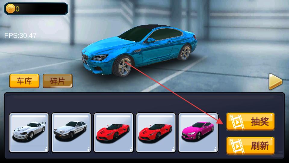 1、進入跑跑停停游戲,在車輛界面點擊抽獎按鈕,觀看廣告參與抽獎,有機會獲取新賽車,豐富車庫車輛。