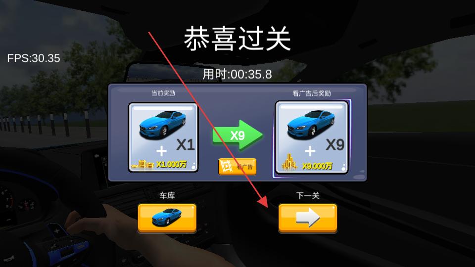 4、成功過關后,選擇領取當前獎勵或觀看廣告獲取更多獎勵,點擊下一關按鈕,繼續挑戰更高難度賽道。