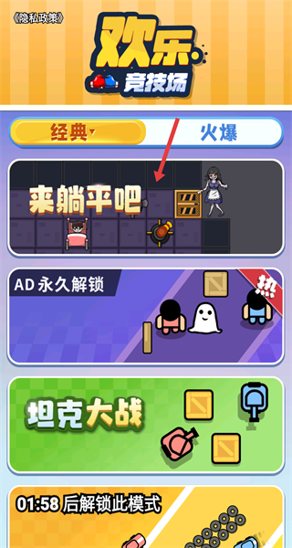 1、游戲主界面有經典,火爆等模式,選擇來躺平吧模式進入對應游戲場景,開啟躺平防守的冒險。