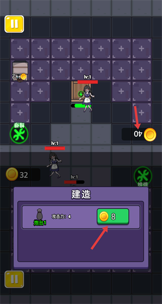 3、當金幣足夠時點擊建造按鈕,花費金幣建造攻擊力的炮臺,增強防御火力更好地對抗敵人。