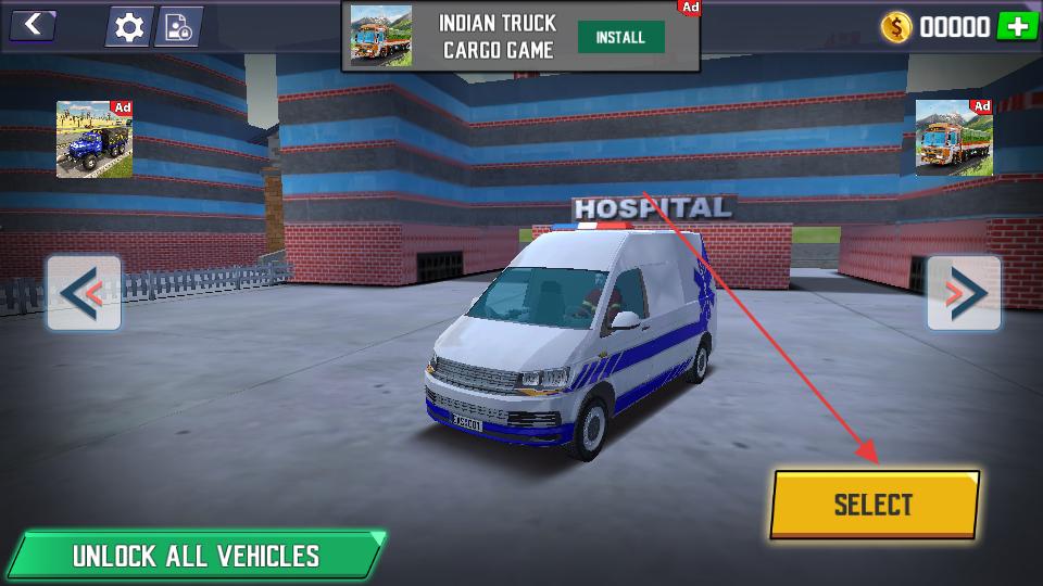 1、打開醫院救護車司機游戲選擇一款救護車,點擊SELECT按鈕,開啟一場救援大戰。
