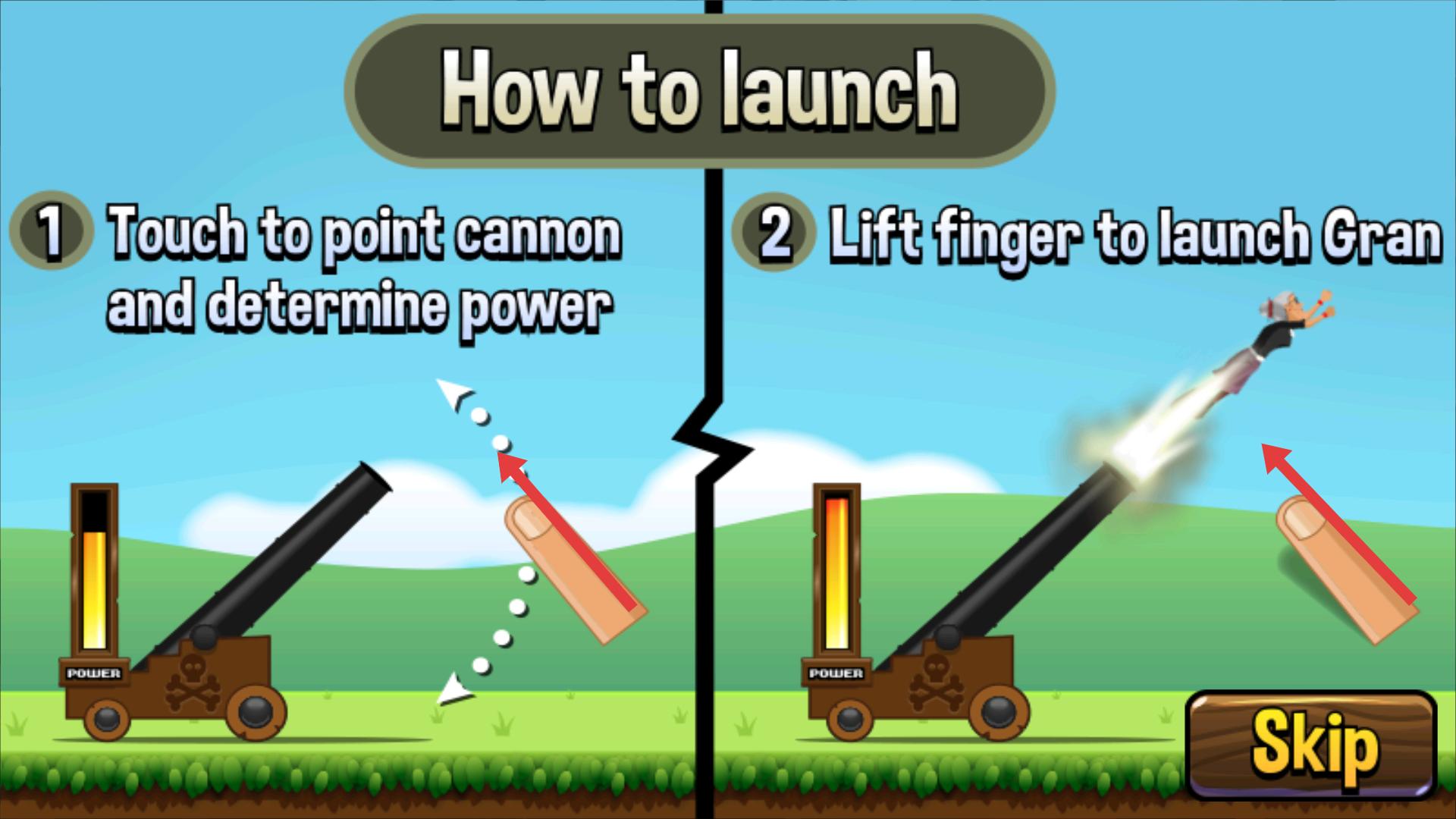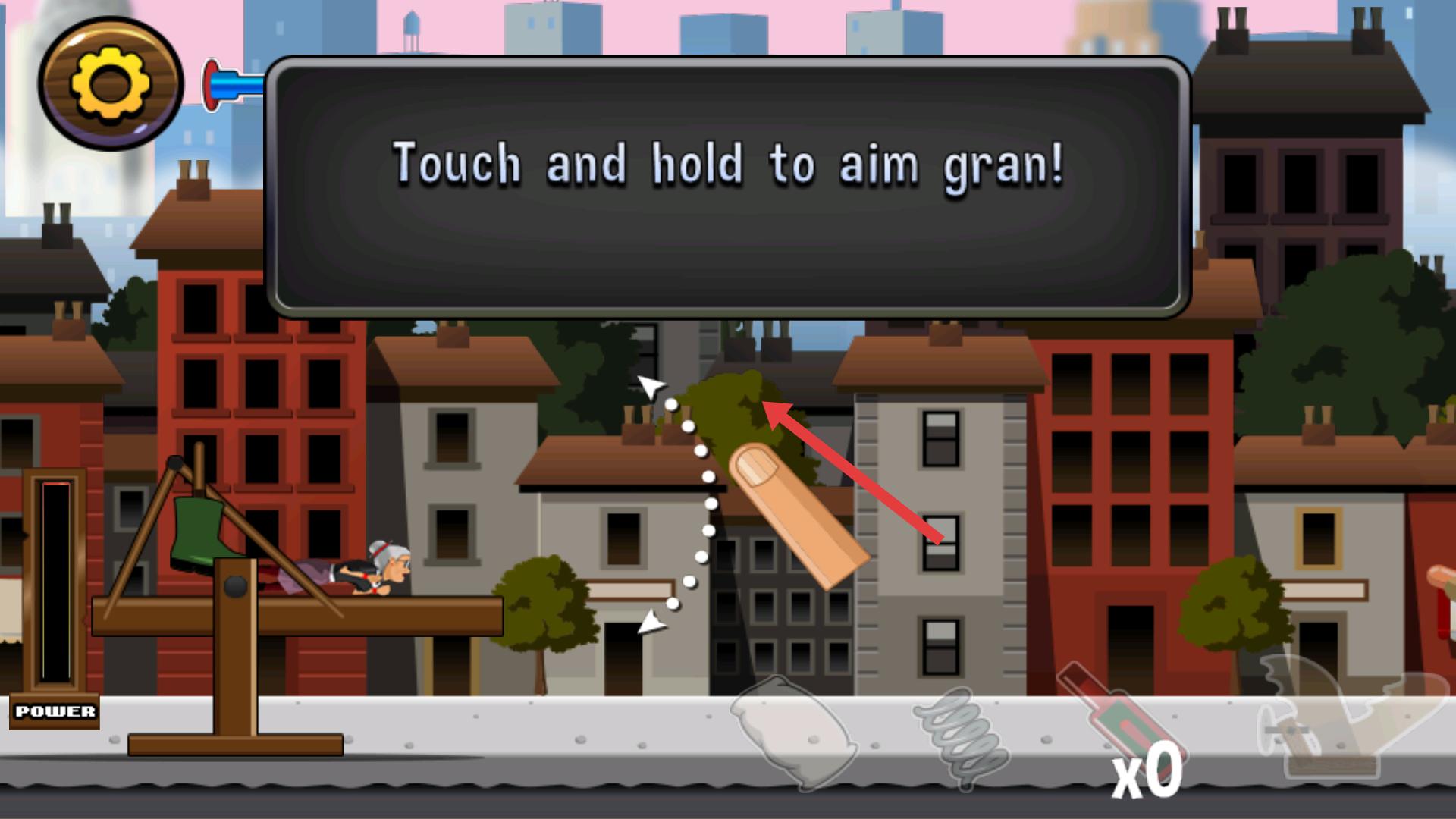 2、進入發射教程界面,要先觸摸屏幕瞄準大炮并確定力量,然后抬起手指,就能發射老奶奶,這是發射的關鍵操作步驟。