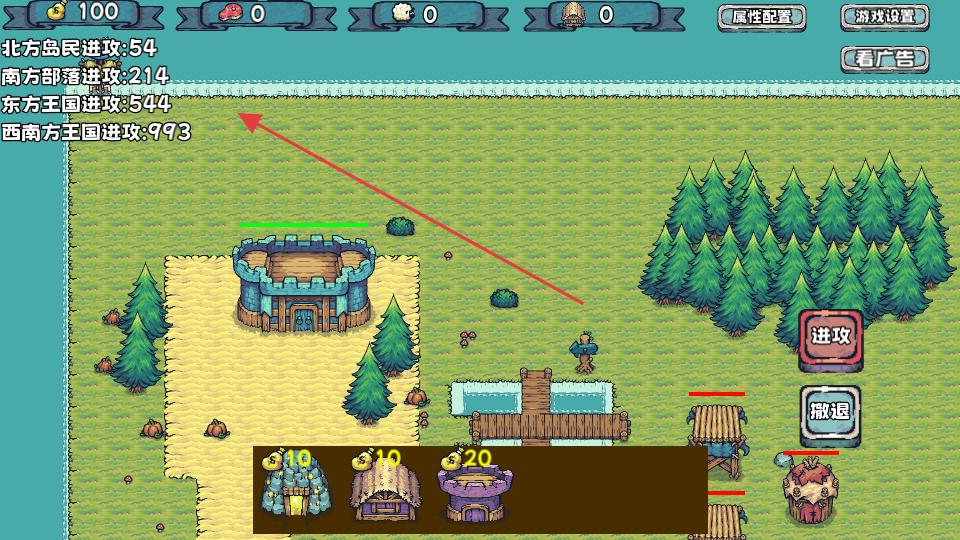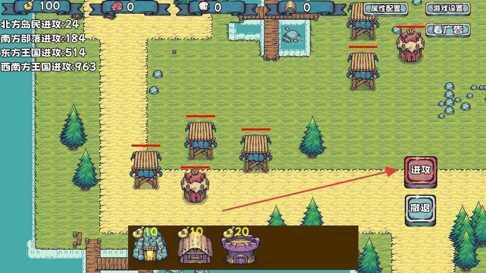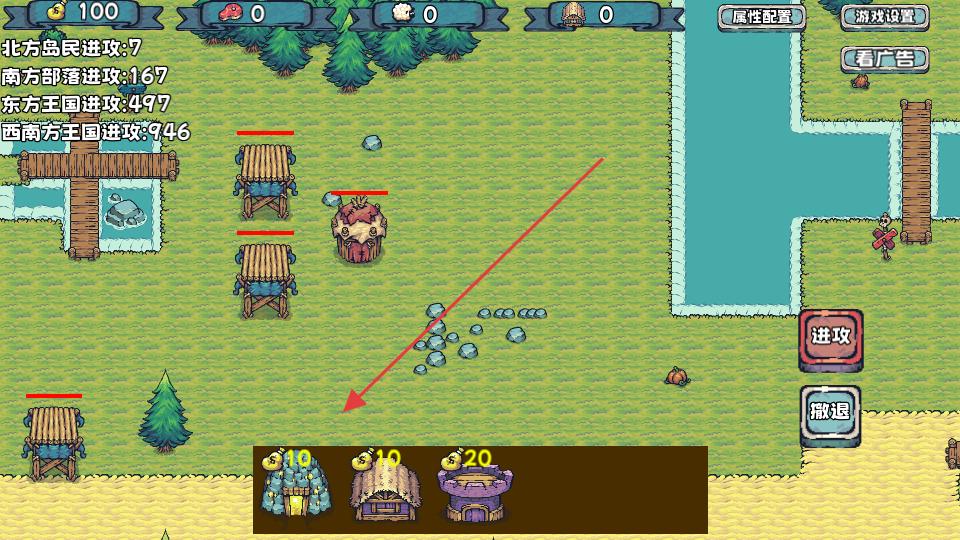 4、底部建筑欄陳列不同成本建筑如10、10、20資源消耗,依據當前資源與戰略需求,選擇合適建筑,放置在關鍵位置,提升防御能力或資源生產效率。