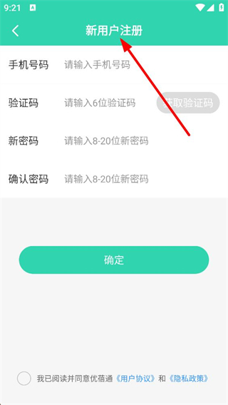 3、點擊新用戶注冊進入對應界面,依次填寫手機號碼、獲取并輸入驗證碼,設置新密碼并確認,勾選協議后點確定完成注冊。