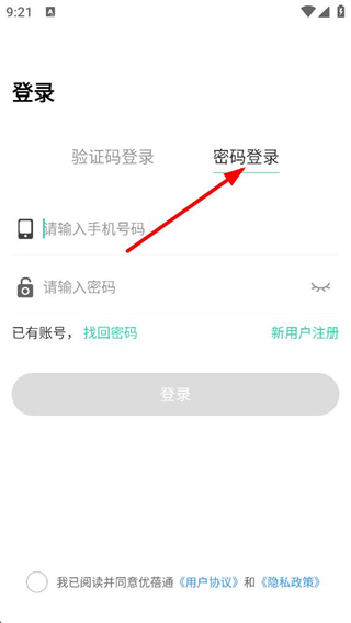 2、切換至密碼登錄選項, 輸入框填寫手機號碼與對應密碼,若密碼遺忘可點擊找回密碼,勾選協議后點擊登錄即可進入。