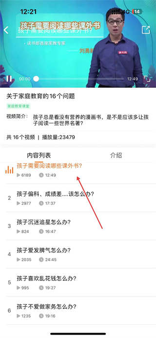 3、在家庭教育課程列表中選擇感興趣的課程條目,比如關于家庭教育的16個問題,點擊該條目,進入課程詳情頁面。
