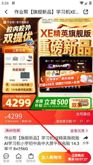 3、進入商品詳情頁可查看產品參數、優惠活動等信息,支持加入購物車或立即購買,同時能查看商品的服務保障與促銷政策。
