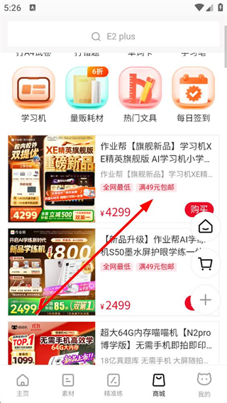 2、商城頁面能查看學習機、耗材等商品,包含不同品類與價格區間,可瀏覽商品信息,選擇感興趣的商品進入詳情頁了解更多內容。