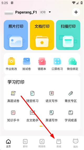 1、進入應用首頁可使用照片打印、文檔打印等功能,還有作業批改、錯題本等學習工具,點擊底部商城板塊可進入商品瀏覽頁面。