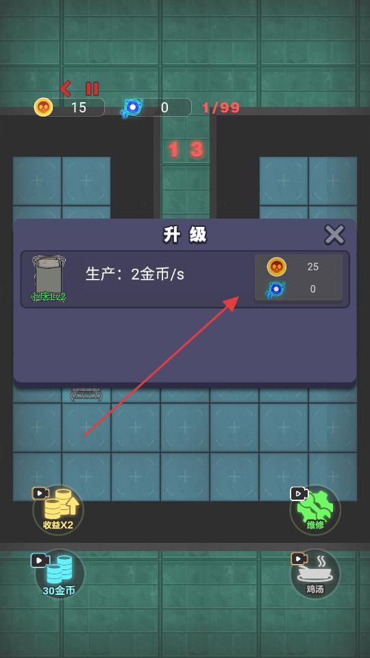 4、點擊場景內生產類設施如垃圾桶樣式,彈出升級界面,消耗積累的金幣如25金幣,提升設施生產速度,增強資源獲取效率。