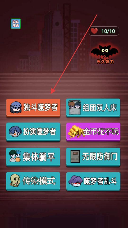 1、進入游戲主界面,選擇獨斗噬夢者模式,進入單人挑戰場景,準備應對噬夢者侵襲,界面顯示體力值與模式選項,確認后開啟生存關卡。