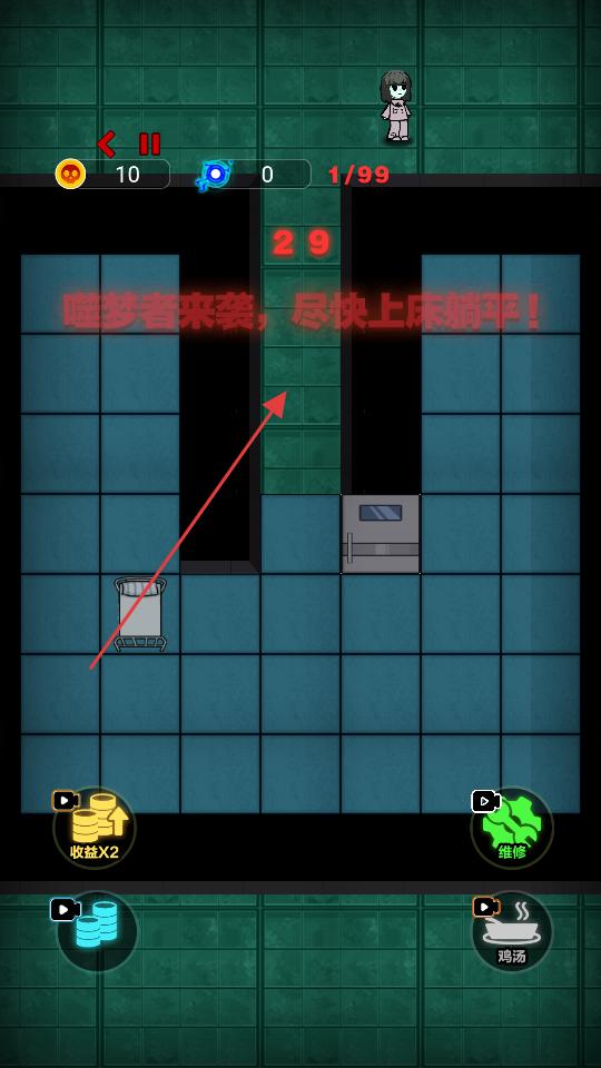 2、關卡內出現噬夢來襲,盡快上床躺平提示,頂部倒計時推進,操控角色在房間內移動,尋找標有綠色區域的床鋪位置,規劃移動路徑避開危險。