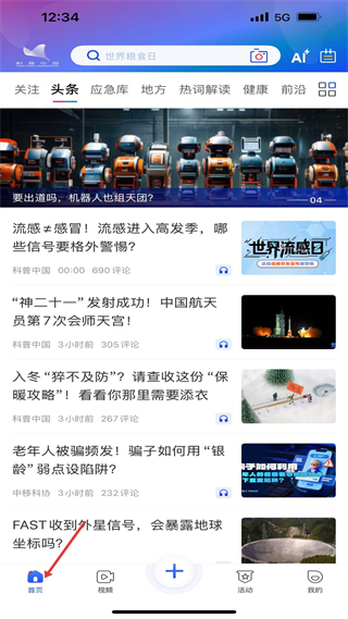 進入科普中國app首頁,通過頂部導航欄瀏覽科學資訊