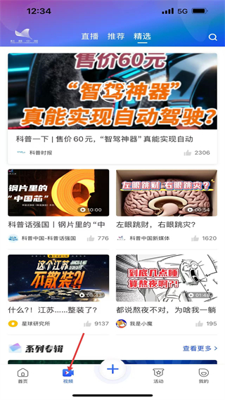 2、視頻板塊含精選等分類,展示智駕神器解析、鋼片里的中國芯、熬夜科普等視頻,以視聽形式呈現科普內容。