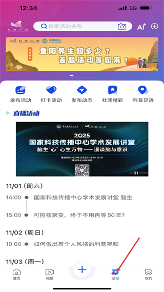 3、活動板塊有發布活動等功能,推出重陽答題、國家科技傳播中心講堂等活動,助力用戶參與科普互動。