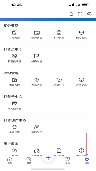 4、我的板塊有積分獎勵、科普員中心等功能,可進行科普員認證、活動管理,還能成為創作者參與科普創作。