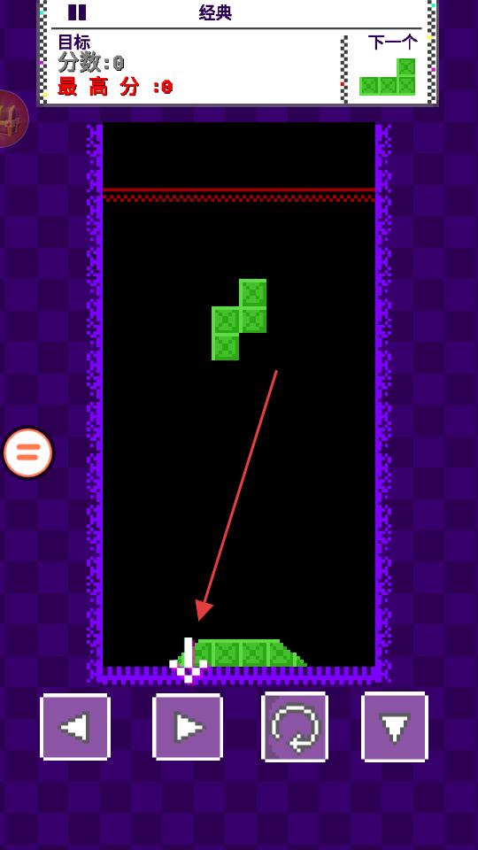 2、綠色方塊開始下落,通過下方的方向按鈕調整方塊的左右位置,讓方塊落到合適的區域,與下方的方塊或邊界貼合,逐步堆積起方塊。