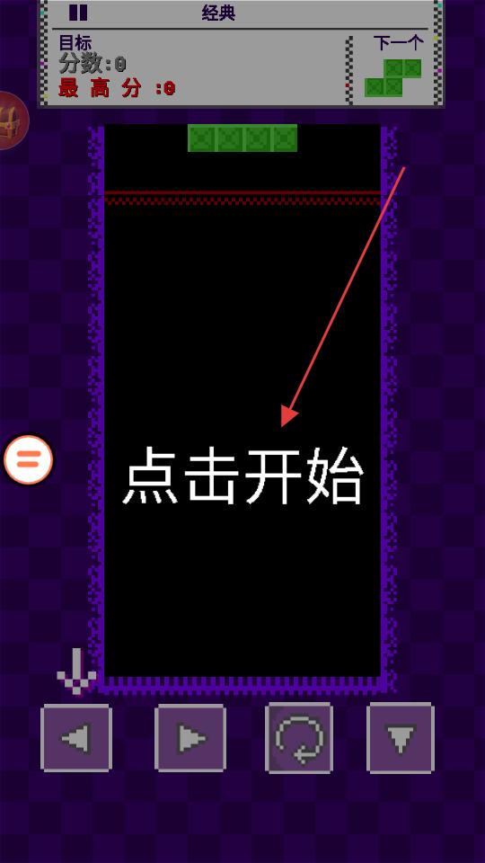 1、在游戲初始界面點擊點擊開始,進入經典方塊堆積場景,此時上方有綠色方塊準備下落,下方是空白區域,開始方塊堆積的闖關。