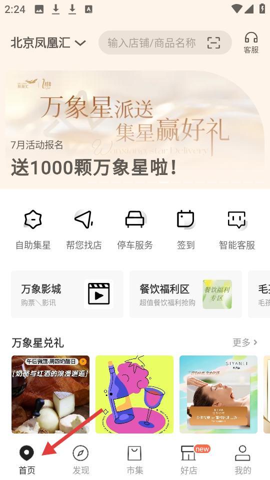 1、點擊首頁7月開展萬象星派送活動,有自助集星、停車服務等功能,還能查看萬象星兌禮。